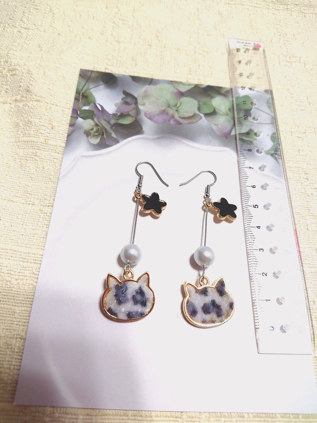 ハンドメイドピアス (イヤリング) ねこ 猫 レオパード ホワイト 星 No94