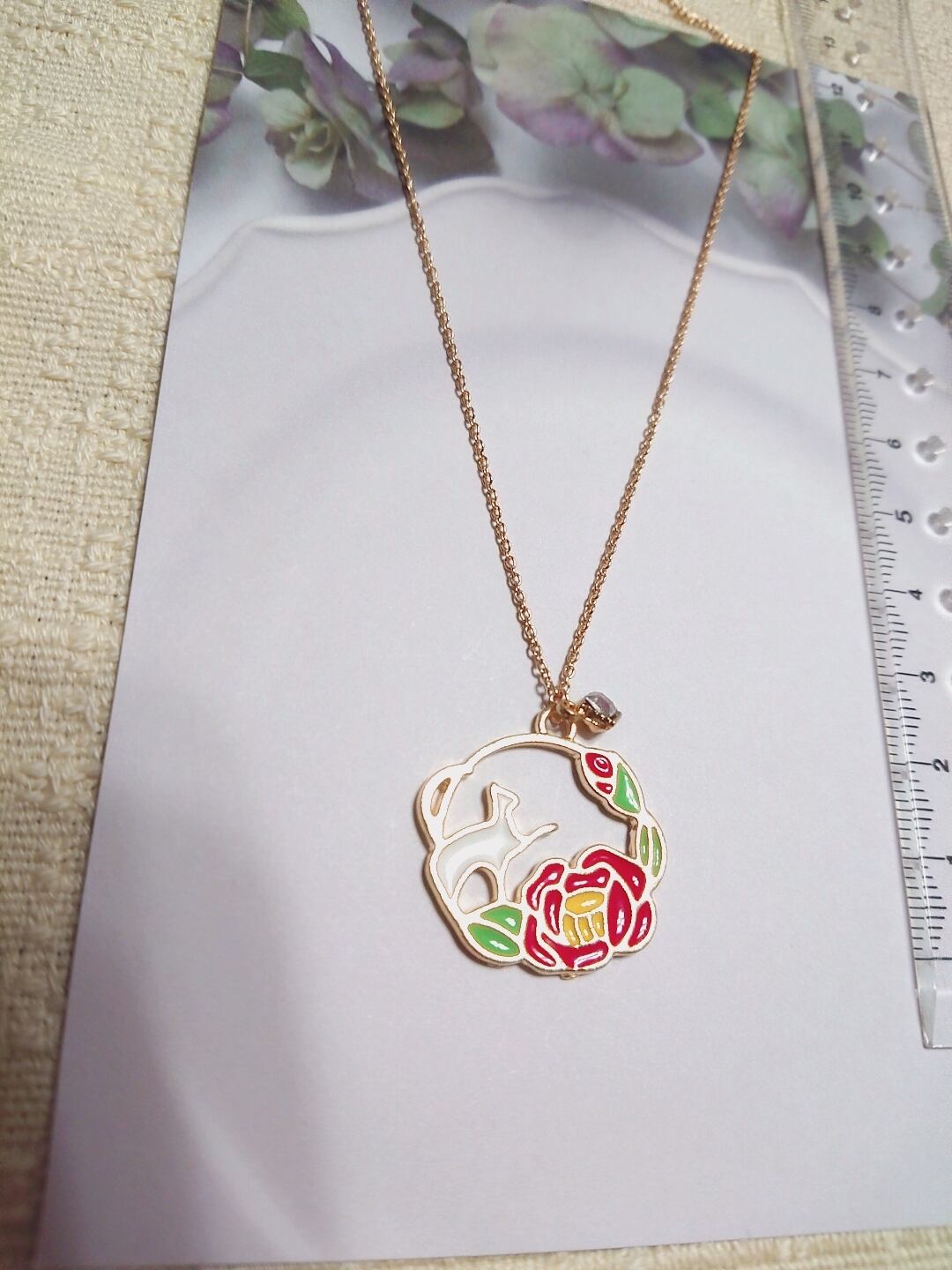 ハンドメイドネックレス お花と猫 フラワー ねこ 赤 アンティーク調No106
