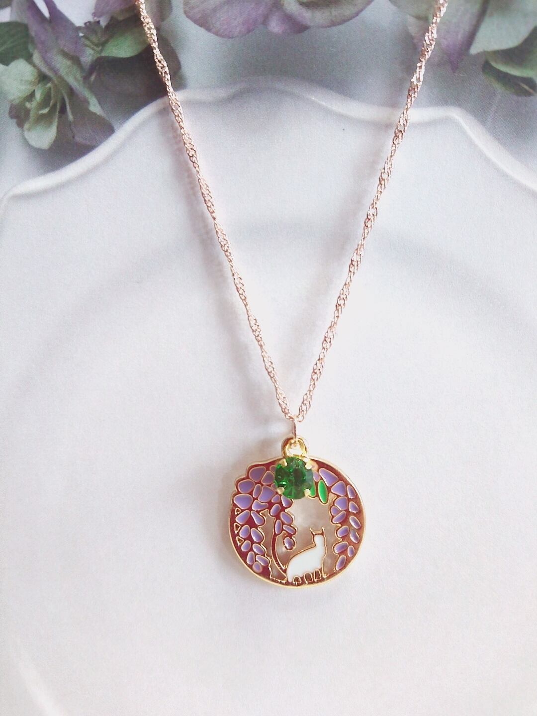 ハンドメイドネックレス 猫とお花 フラワー アンティーク パープルNo112