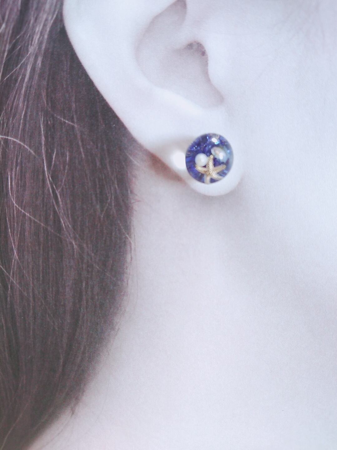 耳元に小さくワンポイントのマリンビーズが夏らしいデザインです☆ミ見る角度によって色が変わってみえて素敵です☆ミ