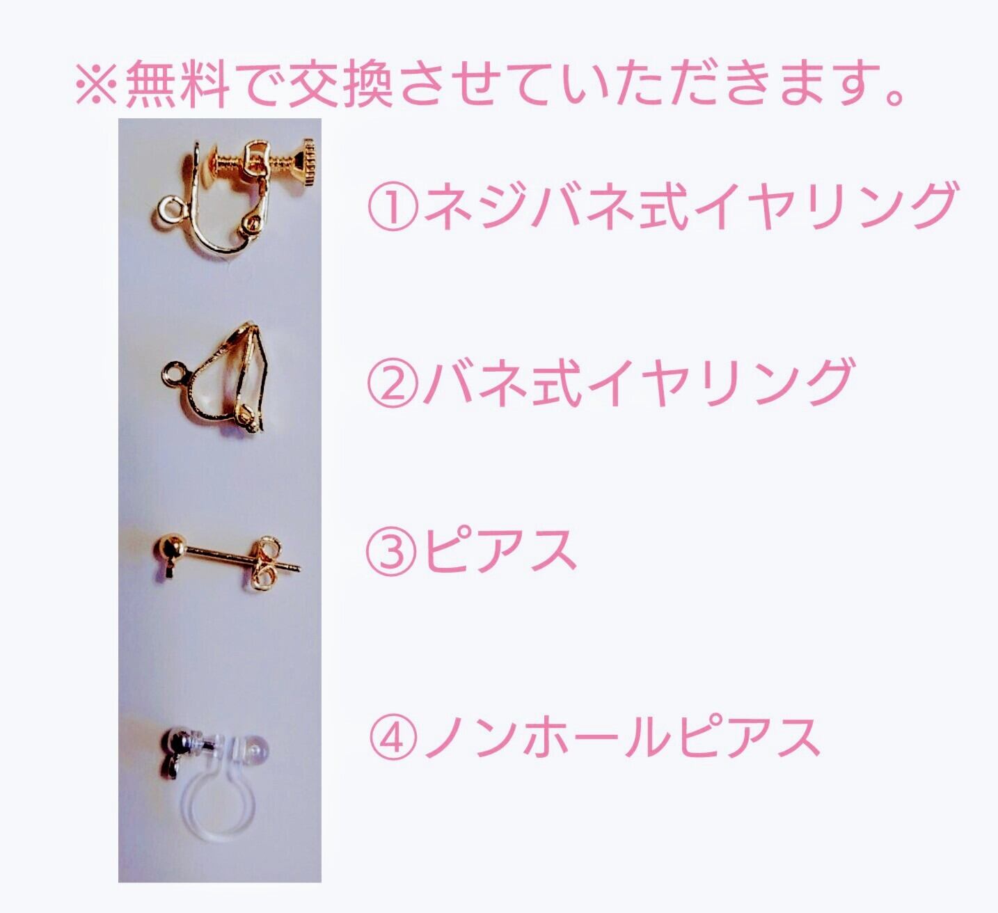 ※無料で変更できますので、変更をご希望の方はコメントにてお申し付け下さい。変更されない場合はフックピアスでのお届けとなります(^^)