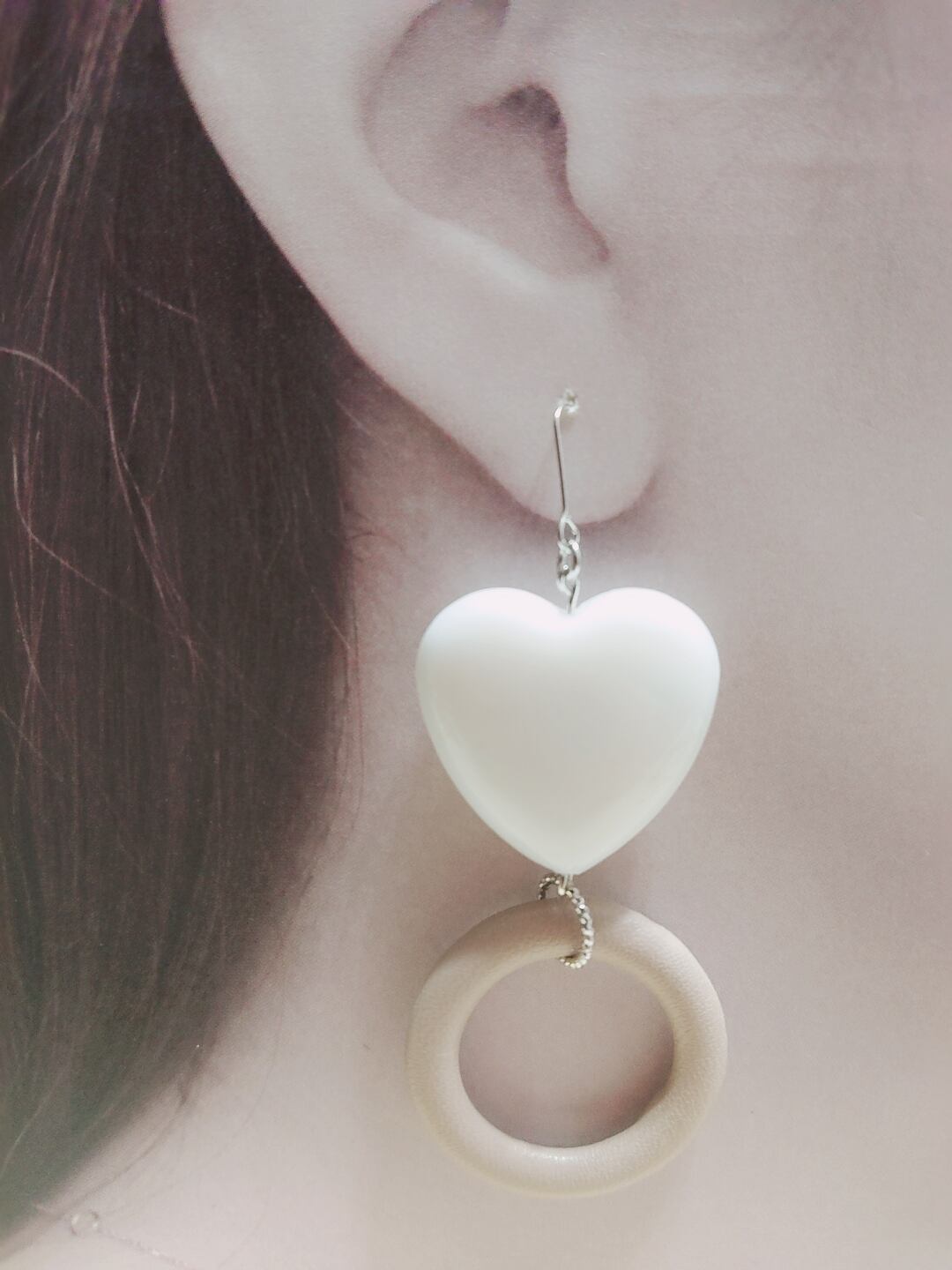 白とエメラルドグリーンのハートとベージュのリングが揺れてとっても可愛いです☆ミ