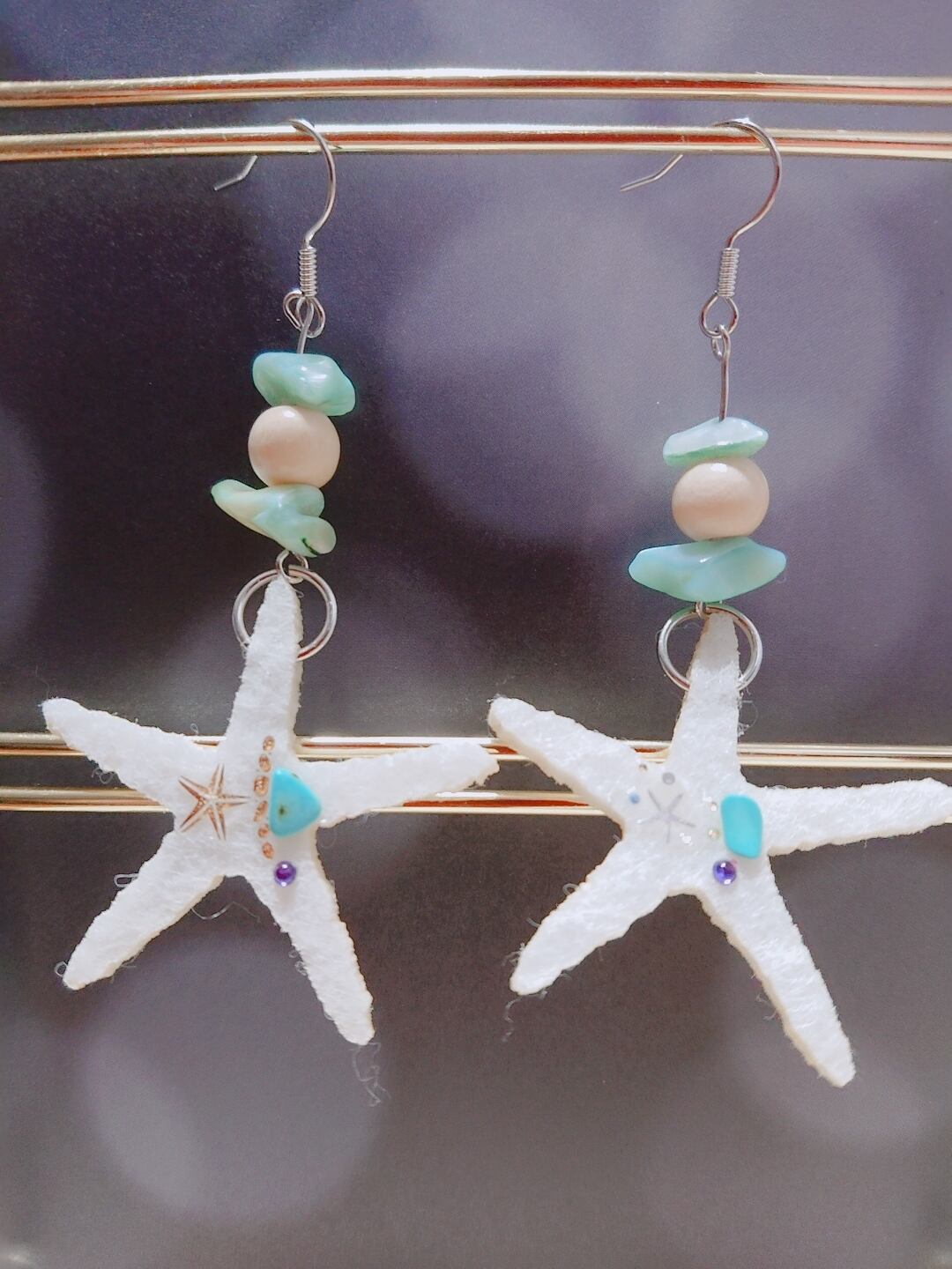夏らしいマリンモチーフのヒトデチャームにはエメラルドグリーンのビーズとラインストーンがついていてとても可愛いデザインです☆ミ