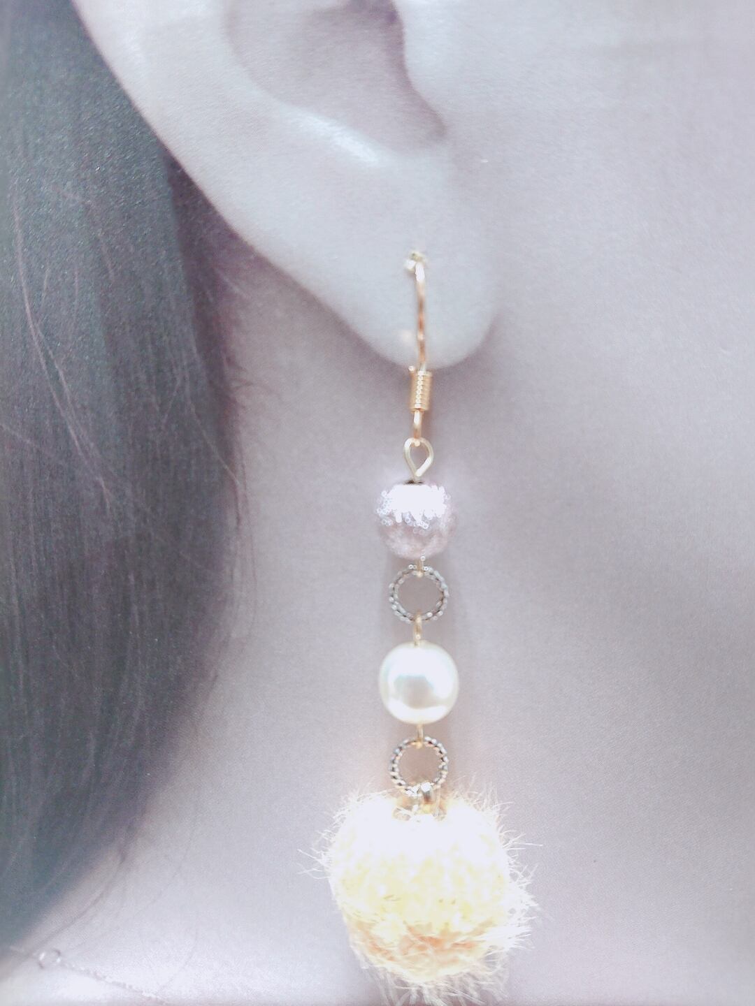 ピンクとイエローのもこもこくるみチャームとパールとシルバーの金具がキラキラ揺れるデザインが特徴でとても可愛いです☆ミ