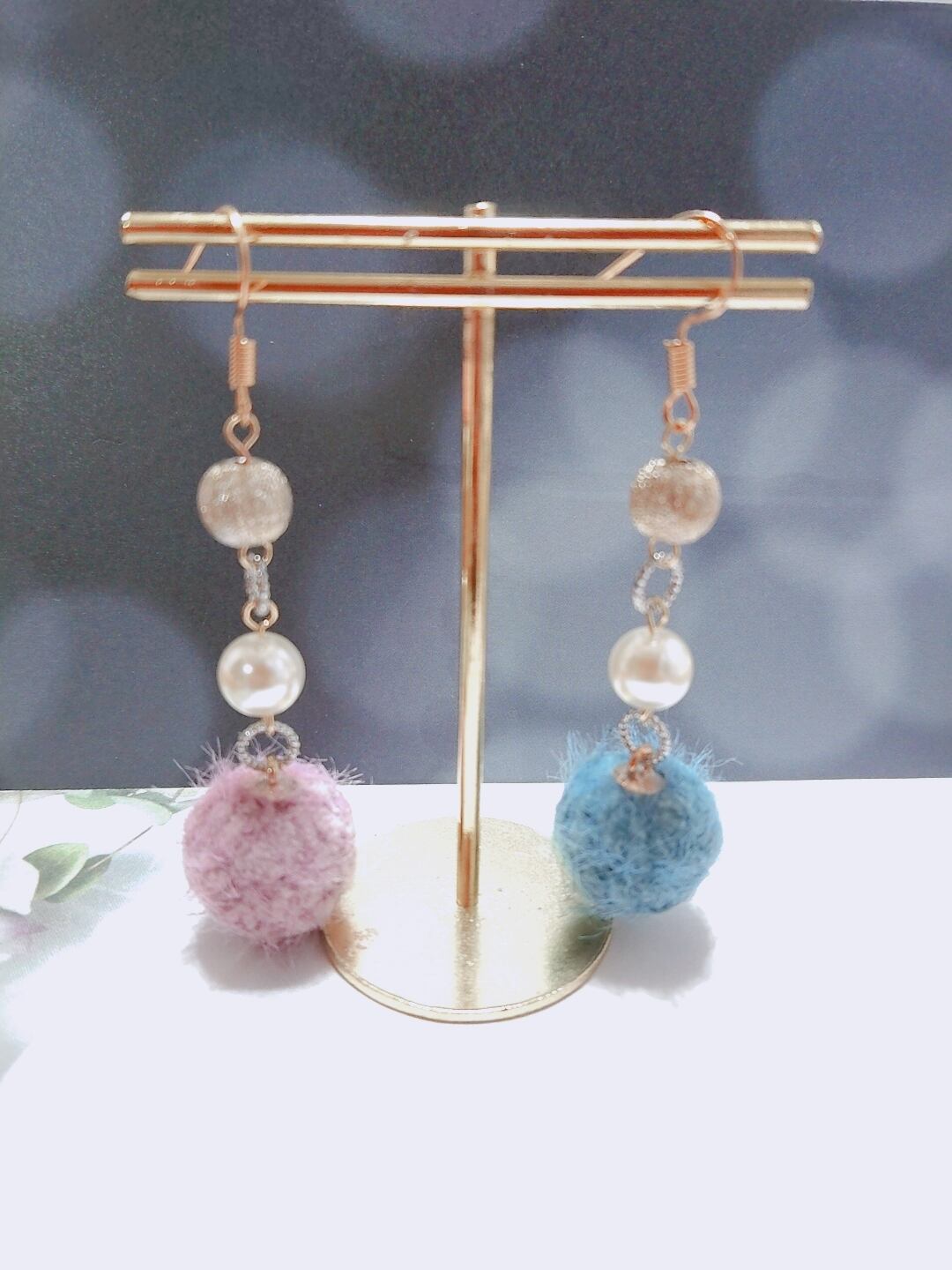 パープルとブルーのもこもこくるみチャームとパールとシルバーの金具がキラキラ揺れるデザインが特徴でとても可愛いです☆ミ