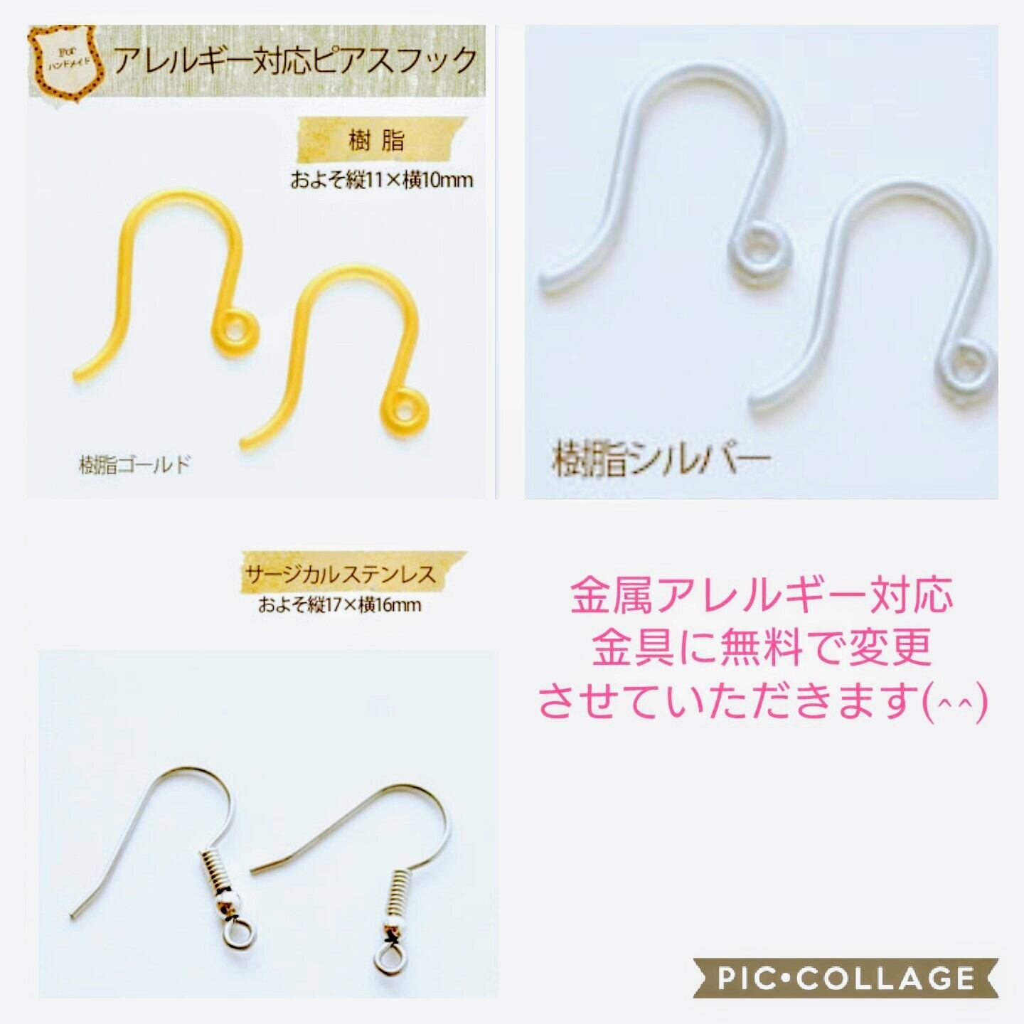 金属アレルギー対応サージカルステンレスフックピアス・樹脂フックピアスにも無料で変更させていただきます(^^)