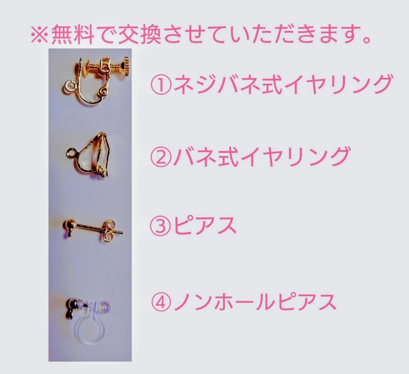 ※無料で変更できますので、変更をご希望の方はコメントにてお申し付け下さい。変更されない場合はフックピアスでのお届けとなります(^^)