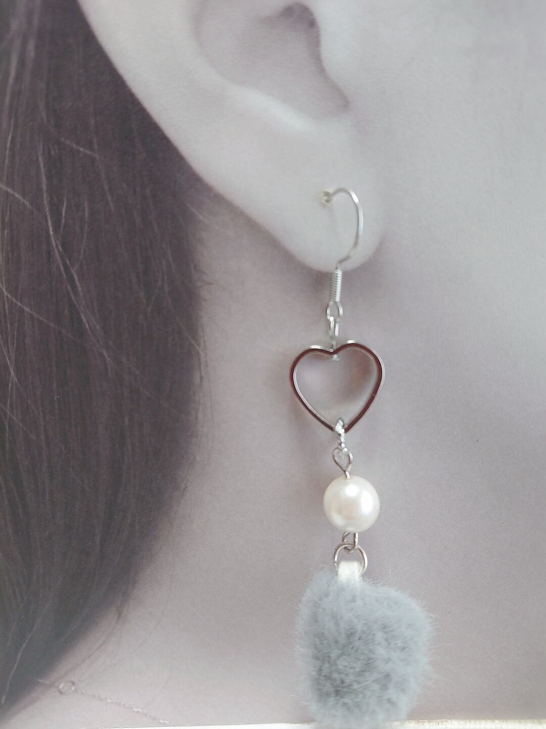 ハートのチャームとグレーのふわふわチャームが揺れるデザインが特徴でとても可愛いです☆ミ